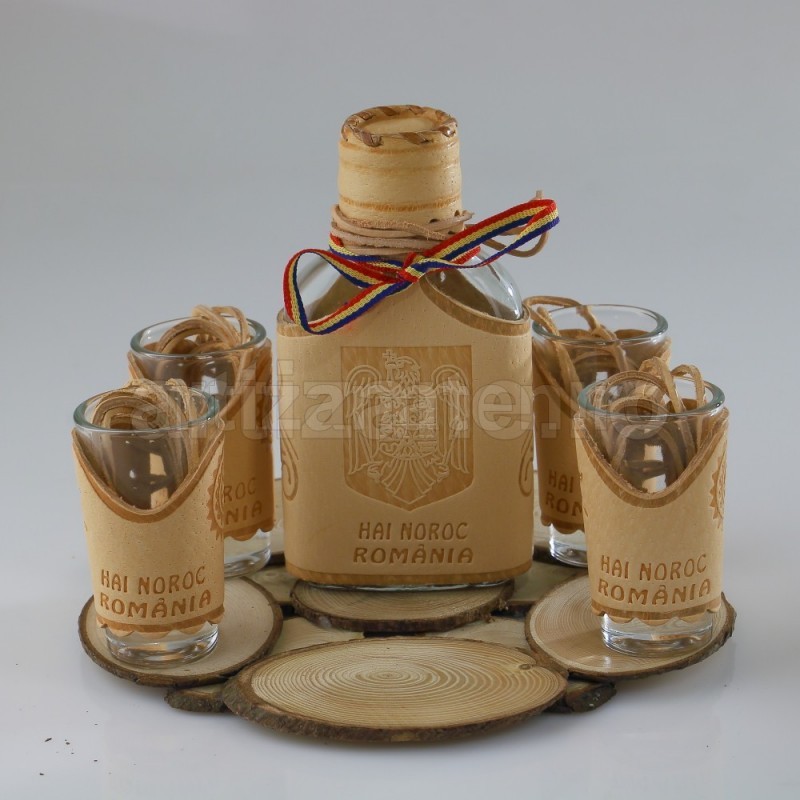 Minibar personalizat ţuică cu ploşcă şi pahare cu husă de piele-România